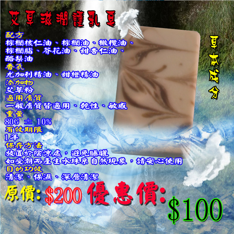艾草滋潤護乳皂 艾草 是頂級的「醫草」,中醫認為艾草具芳香開竅、溫氣血、散寒濕、消毒、防腐之功效,艾葉浴對毛囊炎、濕疹有效。 本草綱目記載 艾草氣味苦、微溫、無毒、治百病,止吐血、婦人漏血、利陰氣、辟風寒、使人有子,所以也有人稱艾草為「醫草」。 艾以葉入藥,性溫、味苦、無毒、純陽之性、通十二經。 艾草煙薰用在人口密集與氣候潮濕的場所,及無毒性和副作用,又無化學藥劑殘留之害且有驅蟲除瘴、淨化增香之效。 艾草 有保溫、造血、安定神經及溫灸功效,相傳可以消災、祈福、避邪平安、供奉神佛、神獸、法器、淨化磁場、淨化天珠、淨化法器、除障 、煙供、除穢氣、增強能量氣場、淨身、淨宅、安定心靈調氣、禪修 、上供下施、沐浴淨身。 此皂以天然食用級艾草粉入皂。